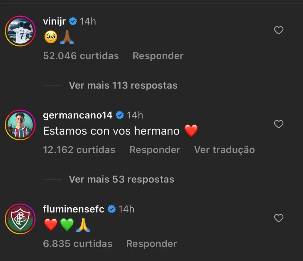 Após o lance que gerou a expulsão de Marcelo na última terça-feira (01), o lateral-esquerdo do Fluminense se pronunciou nas suas redes sociais e recebeu apoio de vários jogadores do clube carioca e de ex-companheiros dos tempos de Real Madrid, entre eles Cristiano Ronaldo, Vinícius Junior e Valverde. Todos se solidarizaram e apoiaram o brasileiro nos comentários.