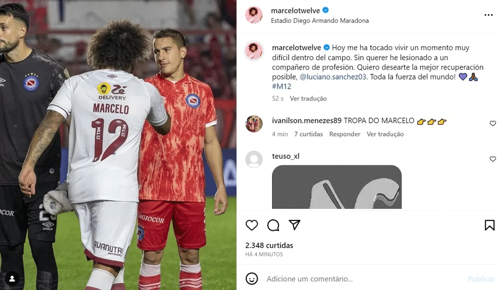 “Hoje vivi um momento muito difícil dentro de campo. Sem querer machuquei um companheiro de profissão. Quero te desejar a melhor recuperação possível, Luciano Sánchez. Toda força do mundo! 💜🙏🏾 #M12”, diz o post de Marcelo.
