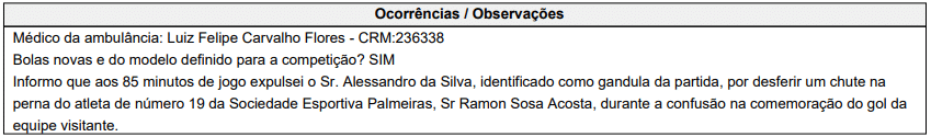 Outro acontecimento que passou despercebido por muitos foi a expulsão de um dos gandulas da partida. O lance aconteceu durante a confusão na comemoração do gol da vitória do Palmeiras, anotado por Flaco López, já no segundo tempo.
