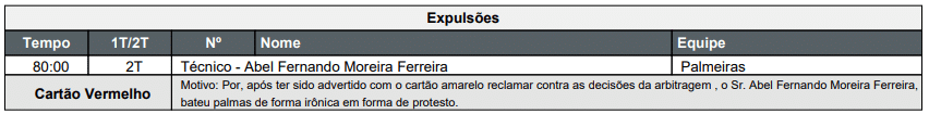 O técnico do Verdão recebeu cartão vermelho aos 35 minutos do segundo tempo por, sendo o juiz, por “bater palmas de forma irônica em forma de protesto”. Antes, o comandante já havia sido advertido com amarelo por contestar as decisões em campo.