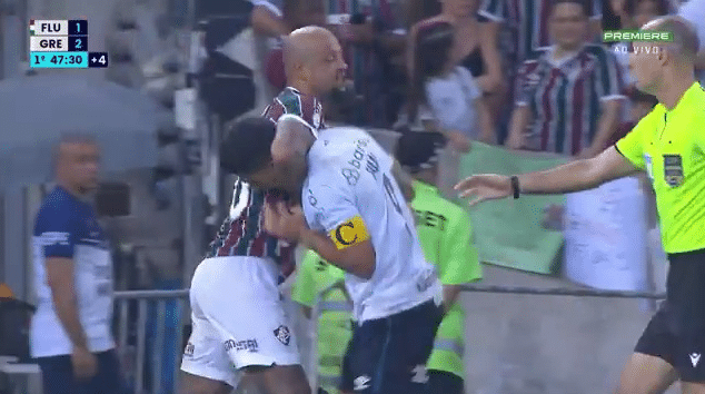 Mesmo em um jogo de pouco valor, Fluminense e Grêmio vêm proporcionando emoção para os torcedores presentes no Maracanã. Foram três gols só na primeira etapa, sendo dois para o Imortal, que vai vencendo por 2 a 1. No momento do segundo tento, Felipe Melo e Luis Suárez roubaram a cena.