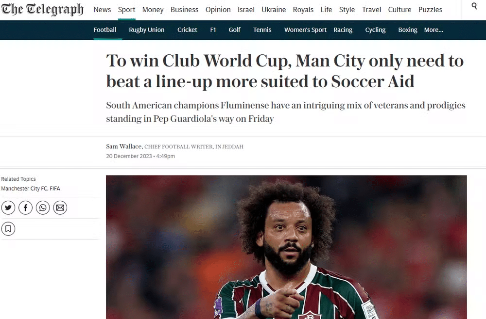 Na última quarta-feira (20), o jornal britânico “The Telegraph” veiculou uma matéria opinativa assinada pelo jornalista Sam Wallace, afirmando que o elenco do Fluminense seria mais adequado ao Soccer Aid, torneio beneficente protagonizado por ex-jogadores de futebol.