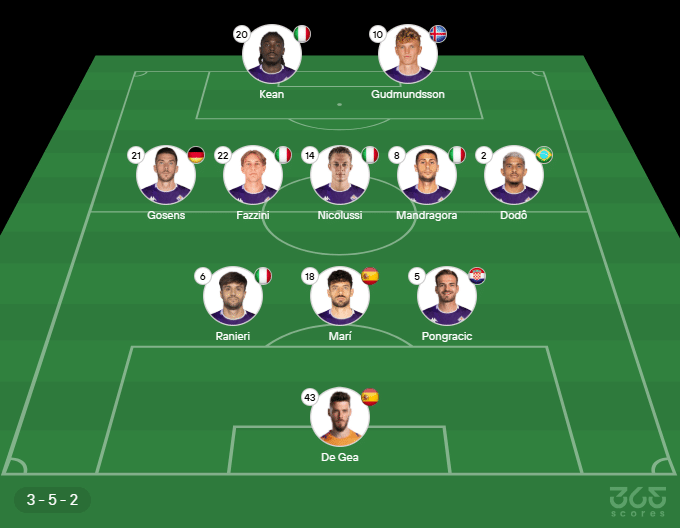Provável escalação da Fiorentina: De Gea; Ranieri, Pablo Marí e Pongracic; Gosens, Fazzini, Nicolussi, Mandragora e Dodô; Moise Kean e Gudmundsson. Técnico: Stefano Pioli.