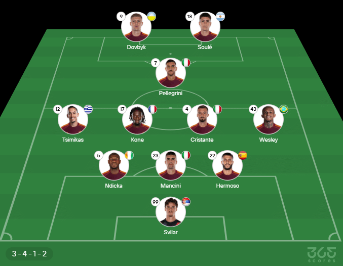 Provável escalação da Roma: Svilar; Ndicka, Mancini e Hermoso; Tsimikas, Kone, Cristante e Wesley; Pellegrini; Dovbyk e Soulé. Técnico: Gian Piero Gasperini.