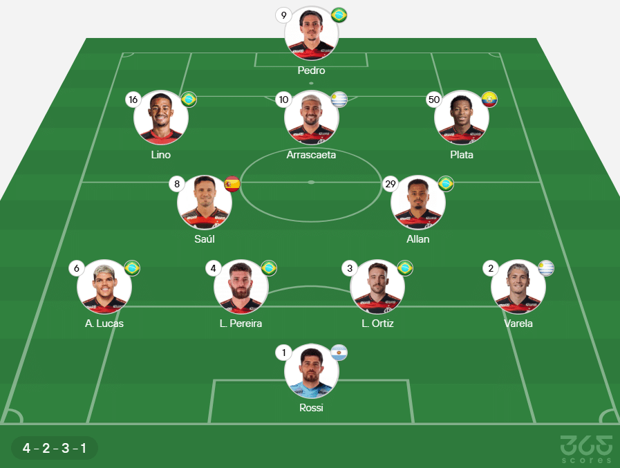 - Provável escalação do Flamengo: Rossi; Varela, Léo Ortiz, Léo Pereira e Ayrton Lucas; Allan e Saúl; Arrascaeta, Gonzalo Plata e Samuel Lino; Pedro.