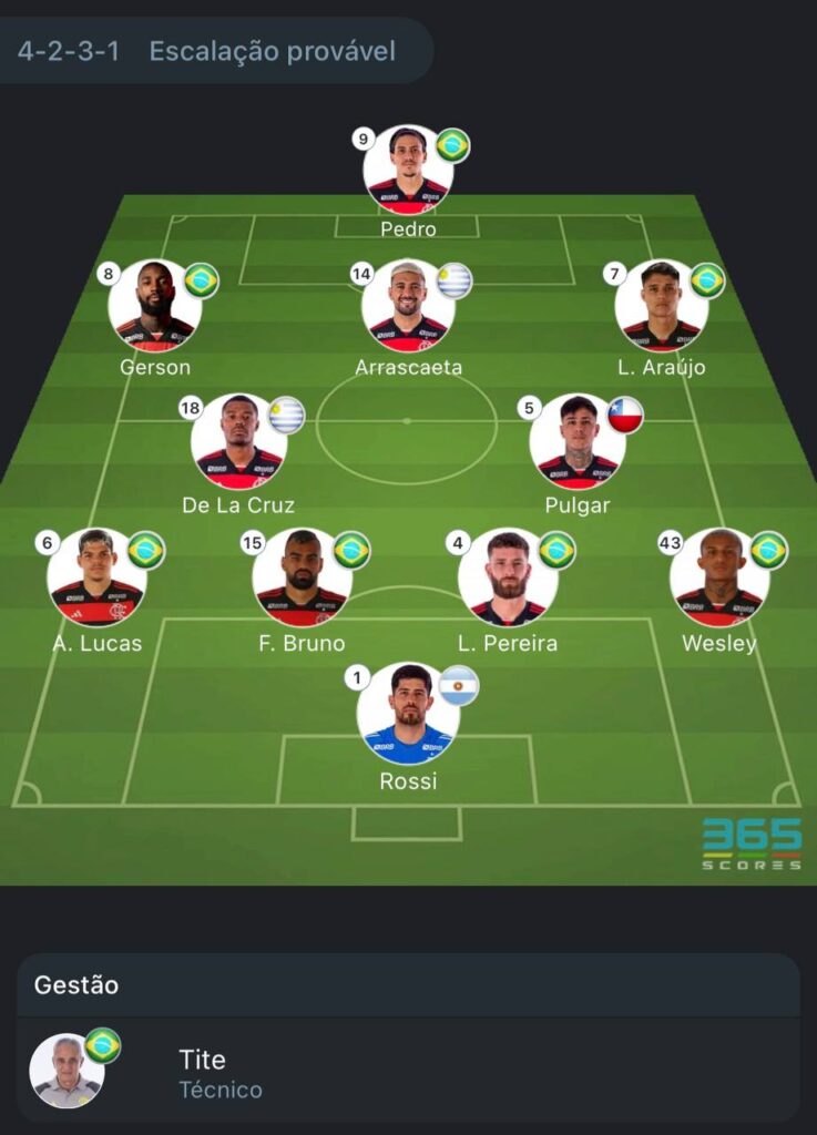 - Escalação da Fla: Rossi, Wesley, Fabricio Bruno, Léo Pereira, Ayrton Lucas, Pulgar, De la Cruz, Gerson, Arrascaeta, Luiz Araujo e Pedro.