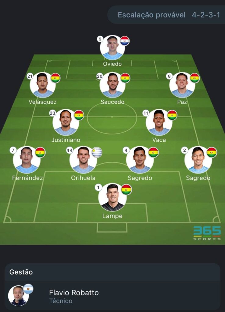 Provável escalação do Bolívar: Lampe; Jesús Sagredo, Orihuela, José Sagredo e Fernández; Justiniano, Vaca, Saucedo, Velásquez e Paz; Oviedo.