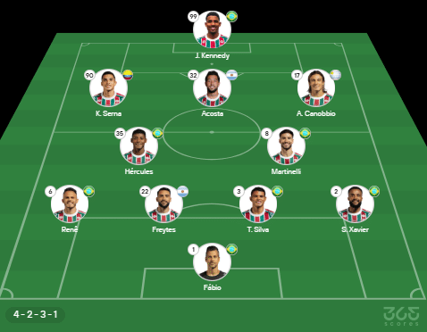 - Provável escalação do Fluminense: Fábio; Samuel Xavier, Freytes, Thiago Silva e Renê; Hércules e Martinelli; Serna, Acosta e Canobbio; John Kennedy