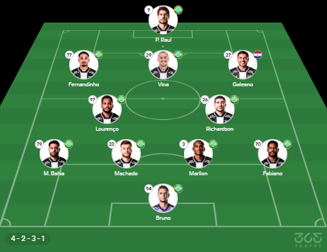 - Provável escalação do Ceará: Provável escalação do Ceará: Bruno; Fabiano, Marllon, Machado e Matheus Bahia; Lourenço e Richardson; Fernandinho, Vina e Galeano; Pedro Raul