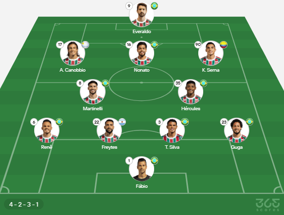 - Provável escalação do Fluminense: Fábio, Guga, Thiago Silva, Freytes, Renê; Hércules, Martinelli, Serna, Canobbio, Nonato; Everaldo