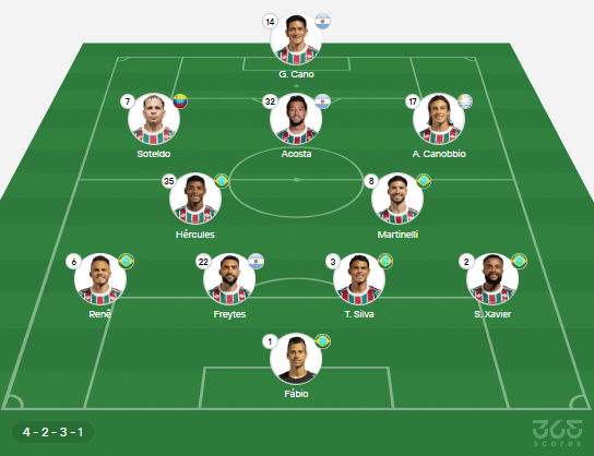 - Escalação do Fluminense: Fábio, Samuel Xavier, Thiago Silva, Freytes, Renê; Martinelli, Hércules, Canobbio, Soteldo, Acosta; Cano