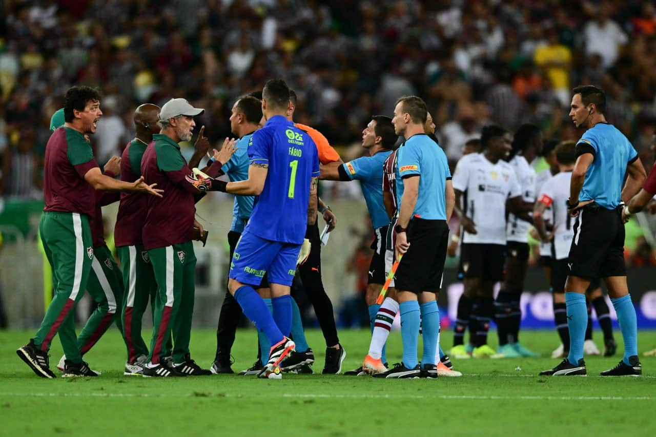 A primeira etapa do jogo de volta da Recopa Sul-Americana, entre Fluminense e LDU, terminou em confusão no Maracanã nesta quinta-feira (29). Ao som do apito final, membros da comissão técnica dos dois times avançaram com reclamações contra a arbitragem.