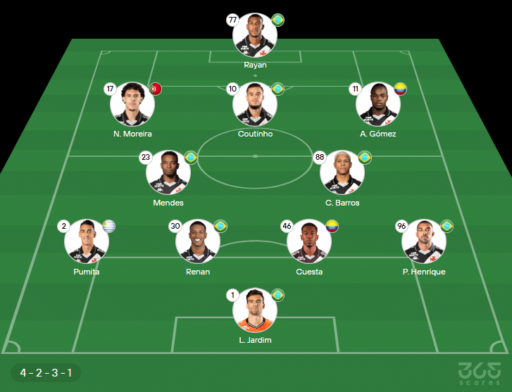 Provável escalação do Vasco: Léo Jardim; Paulo Henrique, Cuesta, Robert Renan, Puma Rodríguez; Barros, Thiago Mendes, Gómez, Nuno Moreira, Coutinho; Rayan. Técnico: Fernando Diniz
