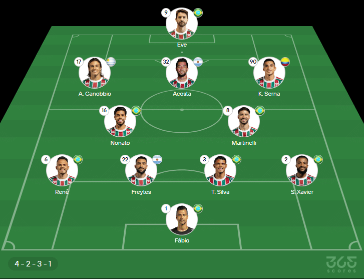 - Escalação do Fluminense: Fábio; Samuel Xavier, Thiago Silva, Freytes, Renê; Martinelli, Nonato, Serna, Canobbio, Acosta; Everaldo