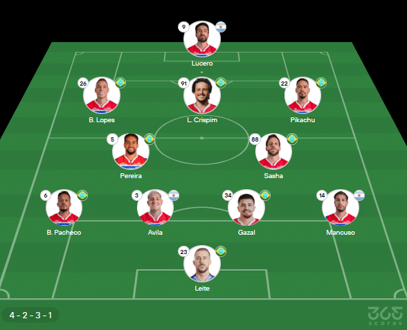 - Provável escalação do Fortaleza: Leite; Mancuso, Gazal, Avila, B Pacheco; Sasha, Pereira, L. Crispim; Pikachu, B. Lopes, Lucero