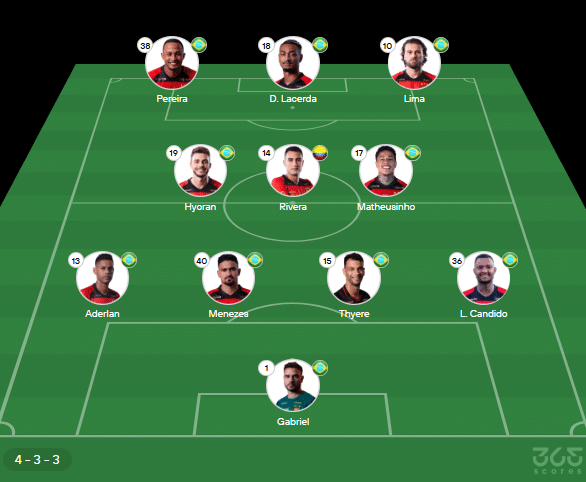 - Provável escalação do Sport: Gabriel; L. Candido, Thyere, Menezes, Aderlan; Matheusinho, Hyoran, Rivera; Lucas Lima, Pereira, D. Lacerda