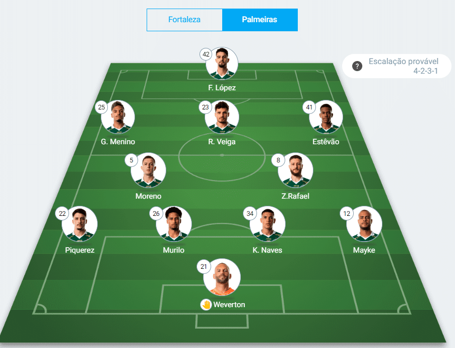- Escalação do Verdão: Weverton; Mayke, Naves, Murilo, Piquerez; Zé Rafael, Moreno; Veiga, Estêvão, Gabriel Menino; Flaco López.