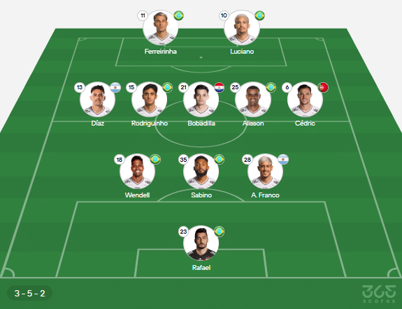 - Provável escalação do São Paulo: Rafael, Alan Franco, Sabino, Wendell; Cédric, Alisson, Bobadilla, Rodriguinho, Díaz; Ferreirinha, Luciano