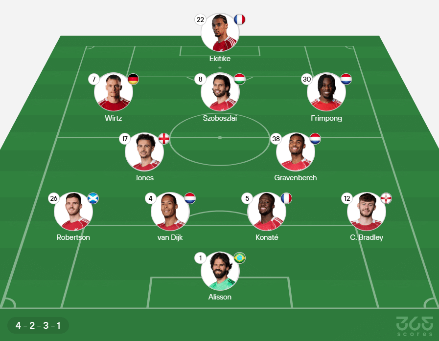 Escalação do Liverpool: Alisson; Bradley, Konaté, Virgil van Dijk, e Robertson; Gravenberch e Curtis Jones; Szoboszlai, Frimpong e Florian Wirtz; Ekitike.