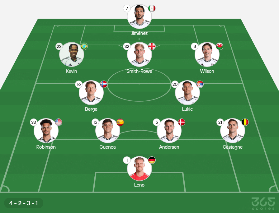 Escalação do Fulham: Leno; Castagne, Adnersen, Cuenca e Robinson; Lukic e Berge; Smith-Rowe, Wilson e Kevin; Jiménez.