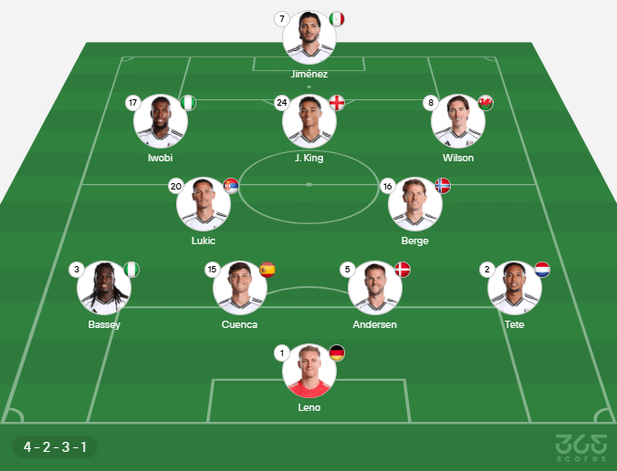 - Provável escalação do Fulham: Leno, Tete, Andersen, Cuenca, Bassey; Berge, Lukic, Wilson, Iwobi, King; Jiménez