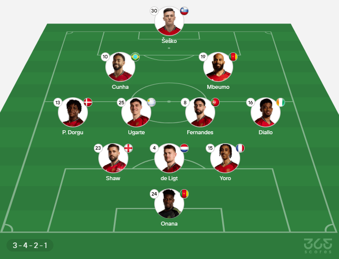 - Provável escalação do Manchester United: Onana, Yoro, De Ligt, Shaw; Diallo, Bruno Fernandes, Ugarte, Dorgu, Mbeumo, Matheus Cunha; Sesko