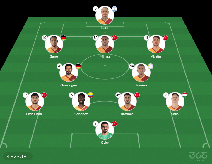 - Provável escalação do Galatasaray: Çakir; Eren Elmali, Davinson Sánchez, Bardakci e Sallai; Gündoğan e Torreira; Sané, Yilmaz e Akgün; Icardi