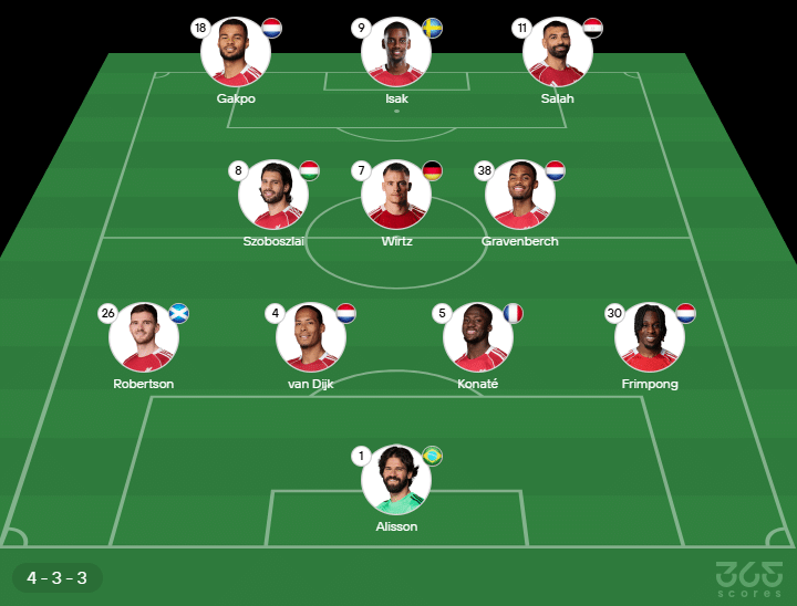- Provável escalação do Liverpool: Alisson; Robertson, van Dijk, Konaté e Frimpong; Szobozlai, Wirtz e Gravenberch; Gakpo, Isak e Salah