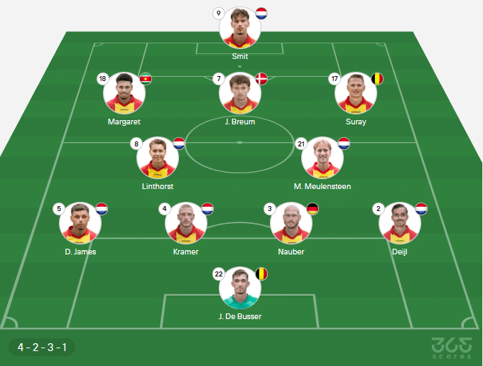 Provável escalação do Go Ahead Eagles: De Busser, Deijl, Nauber, Kramer, James; Meulensteen, Linthorst, Suray, Margaret, Breum; Smit. Técnico: Melvin Boel