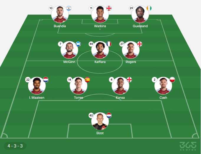 - Provável escalação da Aston Villa: Bizot, Cash, Konsa, Torres, Maatsen; Kamara, McGinn, Rogers; Guessand, Buendía, Watkins
