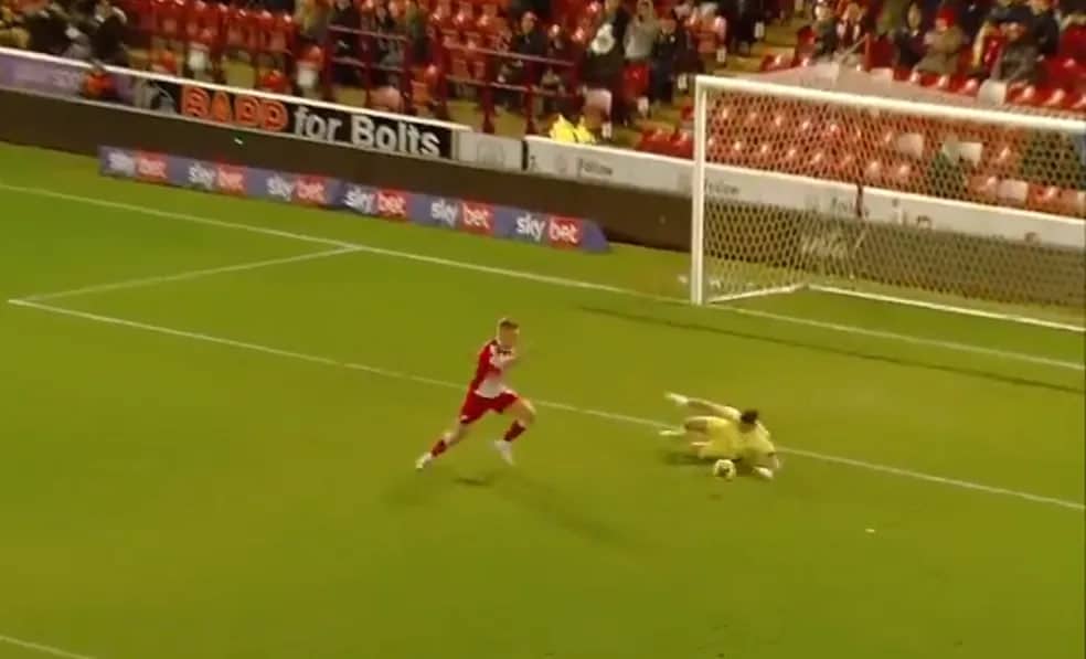 O goleiro do Wycombe, Max Stryjek, recebeu a bola na área e não quis segurá-la com as mãos para ganhar tempo, já que a partida estava no fim. No entanto, o atacante do Barnsley Sam Cosgrove se aproximou do adversário e trombou com ele.