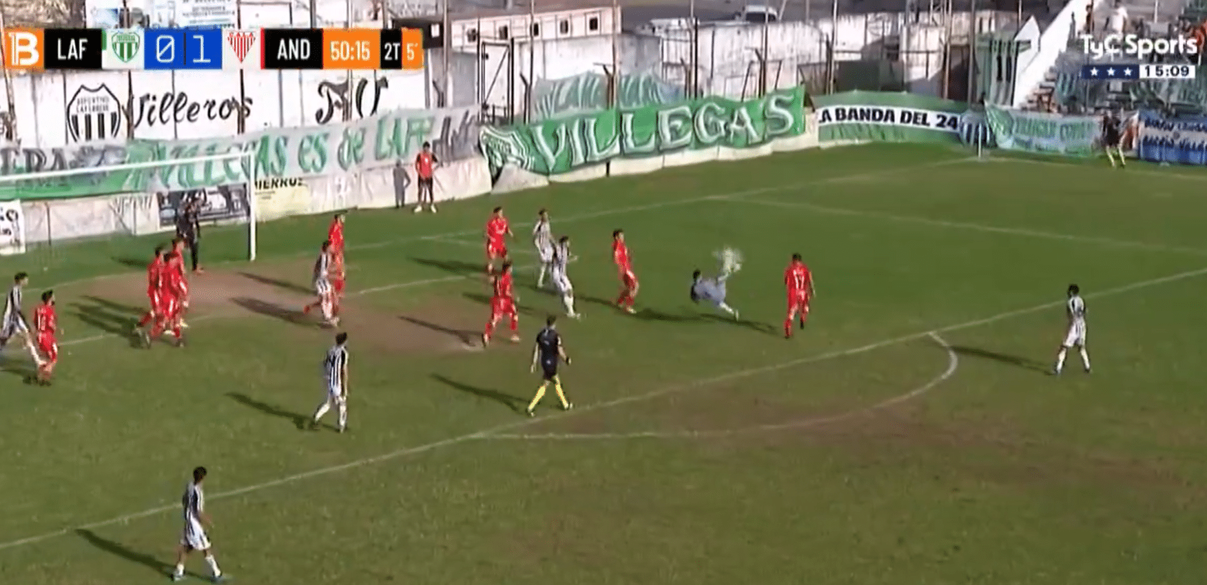 O jogo já estava nos acréscimos do segundo tempo, e o Laferre ia perdendo por 1 a 0. O clube de La Matanza teve um escanteio a favor, na cobrança, o goleiro do Verde Villero foi para a área, a bola sobrou para ele, que mandou uma bicicleta, mas a trave evitou o golaço.