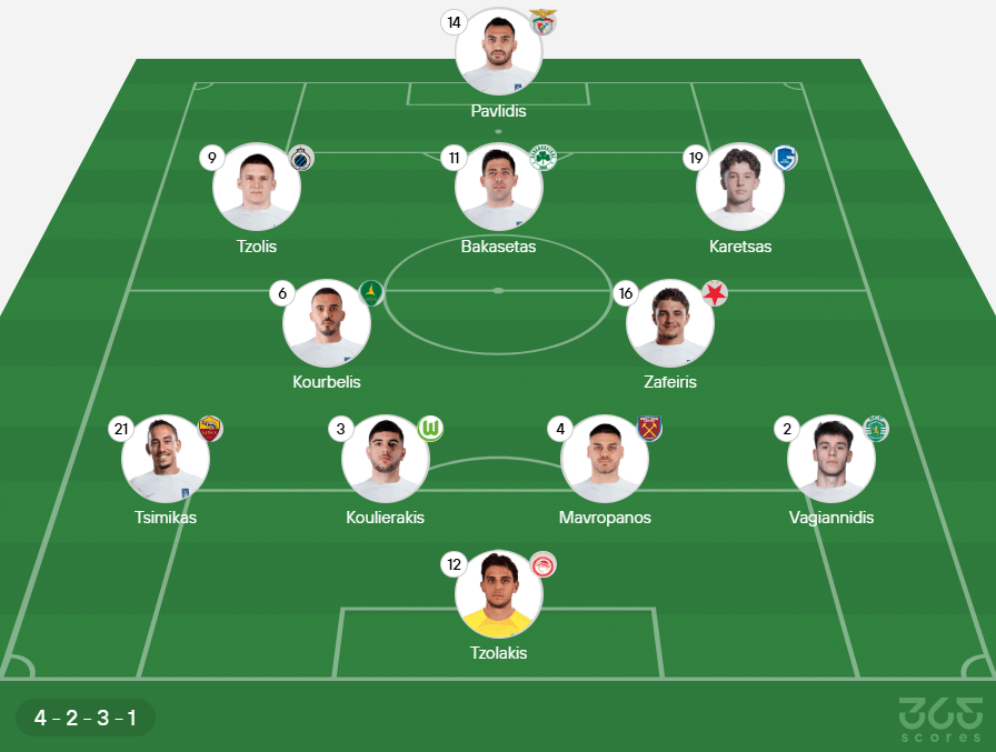 Provável escalação da Grécia: Tzolakis; Vagiannidis, Mavropanos, Koulierakis e Tsimikas; Zafeiris e Kourbelis; Bakasetas, Karetsas e Tzolis; Pavlidis.