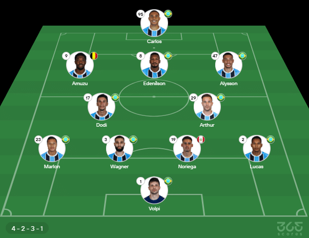 - Provável escalação do Grêmio: Volpi; Lucas, Noriega, Wagner, Marlon; Arthur, Dodi, Edenilson; Alysson, Amuzu, Carlos Eduardo