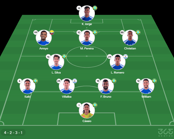 - Provável escalação do Cruzeiro: Cássio; William, Fabrício Bruno, Villalba, Kaiki; Lucas Romero, Lucas Silva, Matheus Pereira; Christian, Arroyo, Kaio Jorge