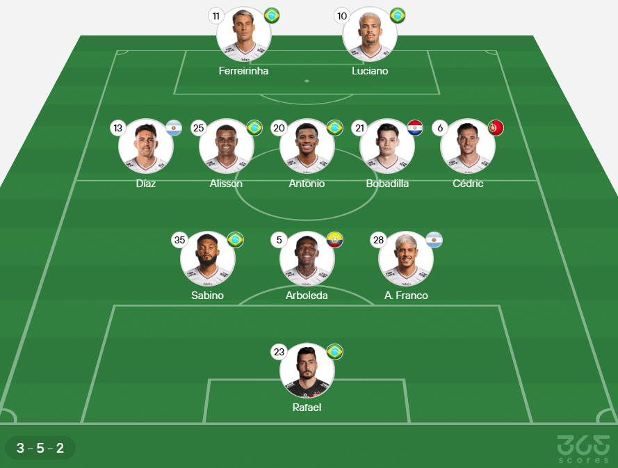 Provável escalação do São Paulo: Rafael; Alan Franco, Arboleda e Sabino; Cedric Soares, Bobadilla, Marcos Antônio, Alisson e Enzo Díaz; Ferreirinha e Luciano.
