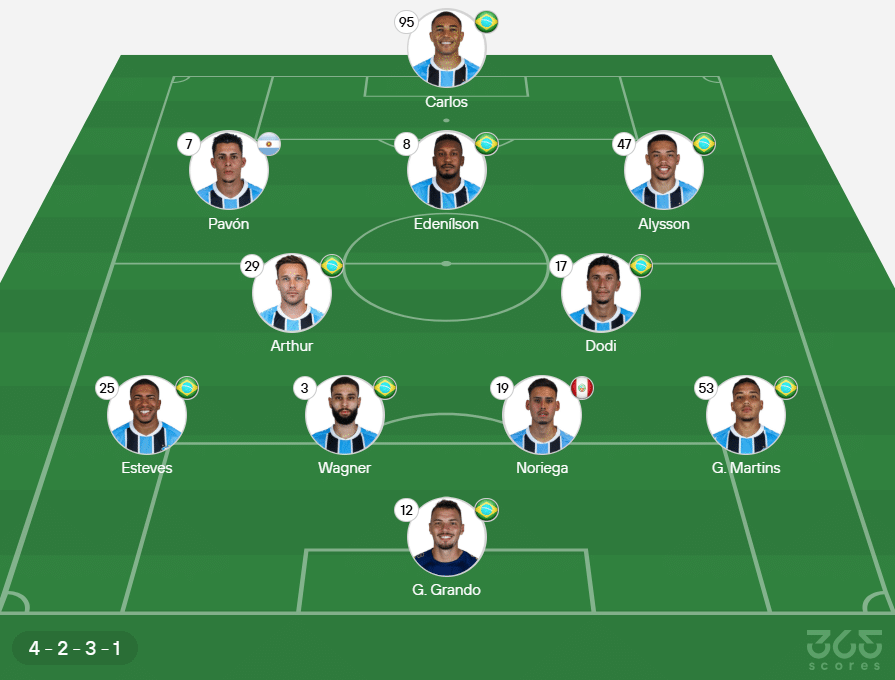 - Provável escalação do Grêmio: Gabriel Grando; Gustavo Martins, Noriega, Wagner Leonardo e Lucas Esteves; Dodi e Arthur; Edenílson, Alysson e Pavón; Carlos Vinícius.