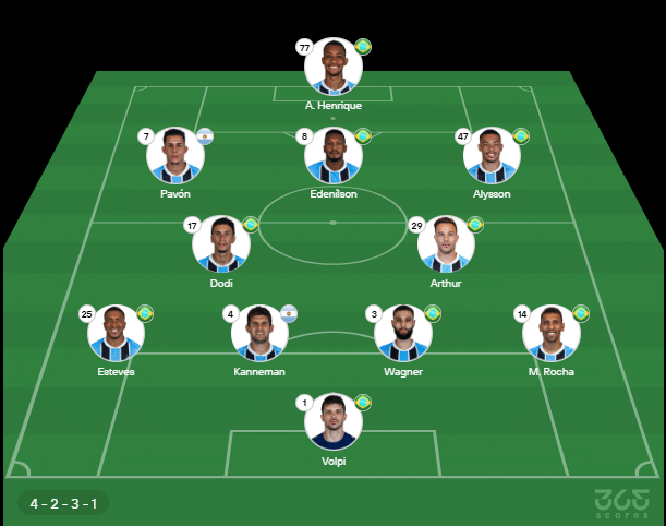 - Provável escalação do Grêmio: Volpi; Marcos Rocha, Wagner, Kanneman, Lucas Esteves; Arthur, Dodi, Edenilson; Alysson, Pavón, A. Henrique