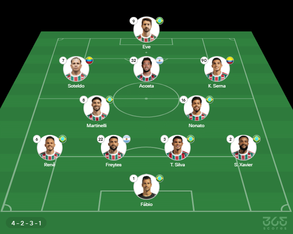 - Provável escalação do Fluminense: Fábio; Samuel Xavier, T. Silva, Freytes, Renê; Nonato, Martinelli, Acosta; Serna, Soteldo, Eve