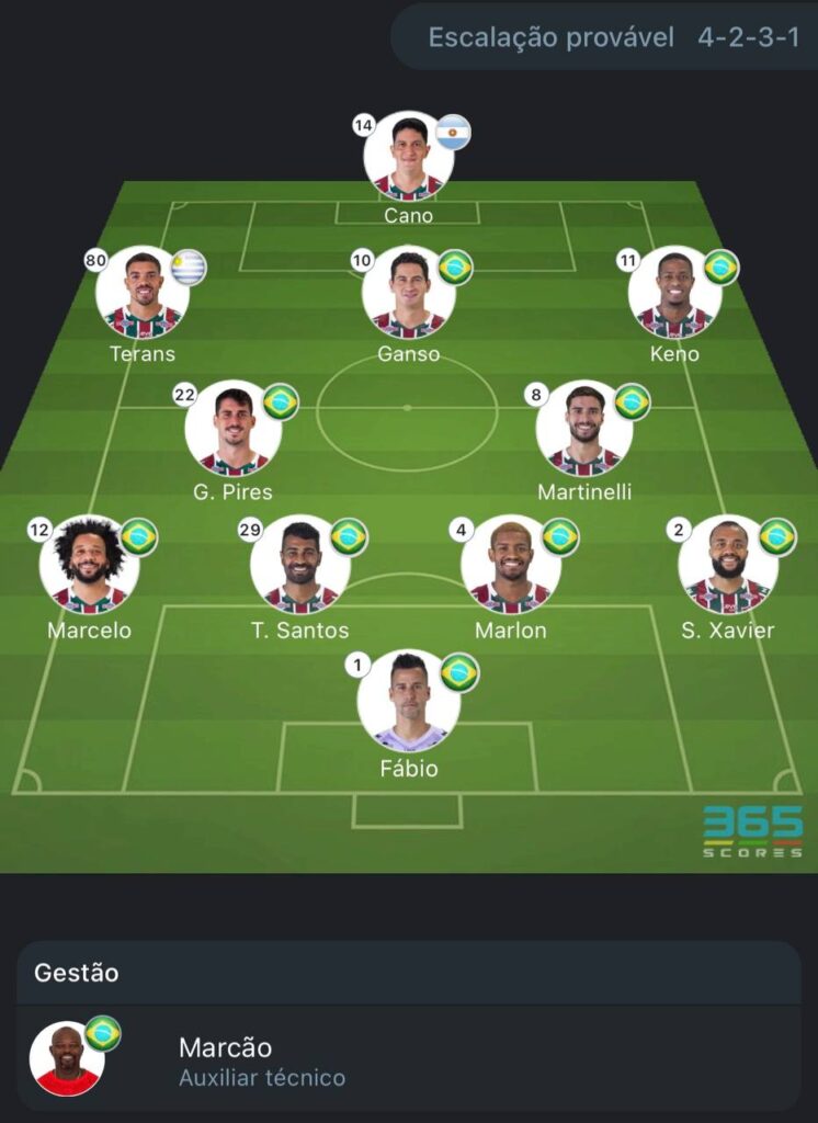 - Escalação do Fluminense: Fábio, Samuel Xavier, Marlon, Thiago Santos e Marcelo; Martinelli e Gabriel Pires; Keno, Ganso e Terans; Cano.