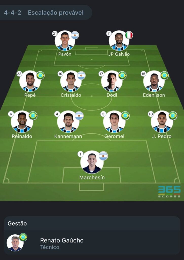 Provável escalação do Grêmio: Marchesín, João Pedro, Geromel, Kannemann e Reinaldo; Edenilson, Dodi, Cristaldo e Pepê; JP Galvão e Pavón.