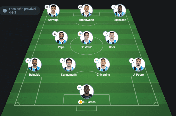 - Provável escalação do Grêmio: Caique Santos, Reinaldo, Kannemann, Gustavo Martins e João Pedro; Pepê, Cristaldo e Dodi; Aravena, Edenílson e Braithwaite