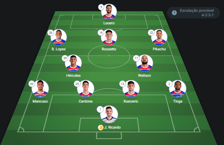 - Provável escalação do Fortaleza: João Ricardo, Mancuso, Cardona, Kuscevic e Tinga; Hércules, Zé Welison, Breno Lopes, Rossetto e Yago Pikachu; Lucero