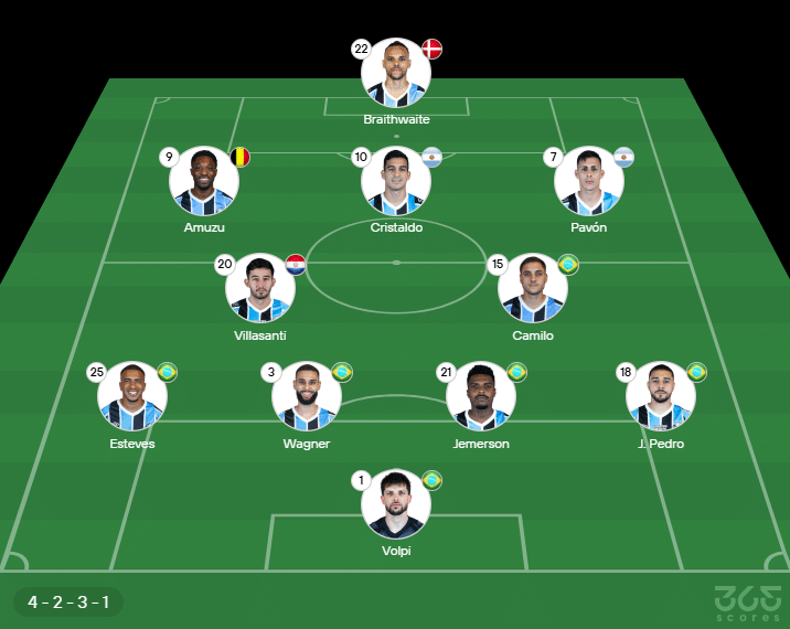 - Provável escalação do Grêmio: Volpi, Esteves, Wagner Leonardo, Jemerson e João Pedro; Villasanti, Camilo, Amuzu, Cristaldo e Pavón; Braithwaite