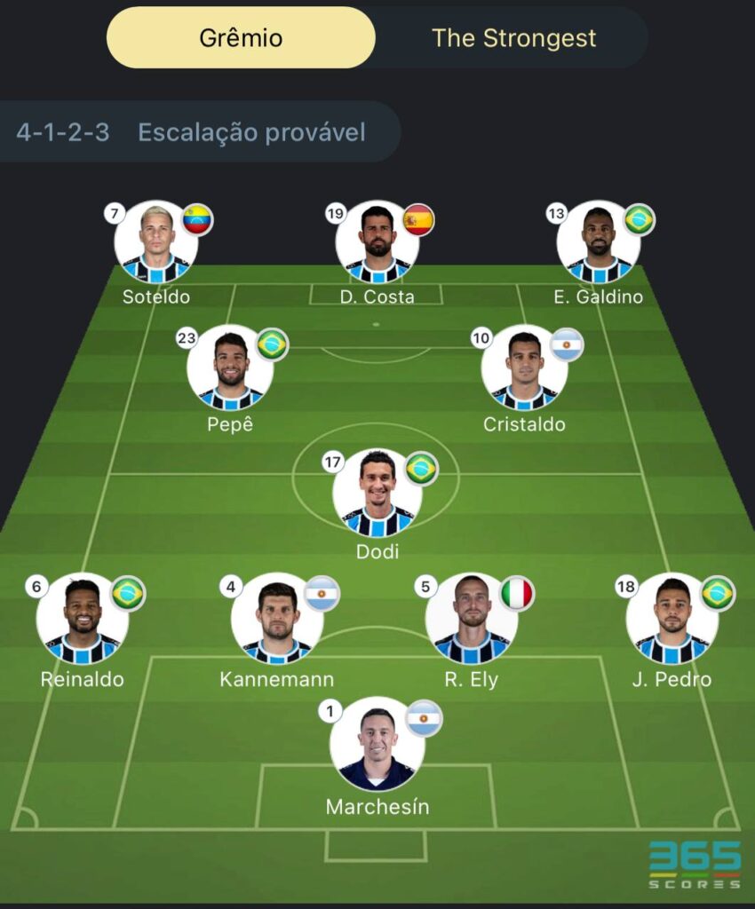 - Escalação do Grêmio: Marchesín; João Pedro, Rodrigo Ely, Kannemann e Reinaldo; Dodi, Pepê, Cristaldo, Galdino e Soteldo; Diego Costa