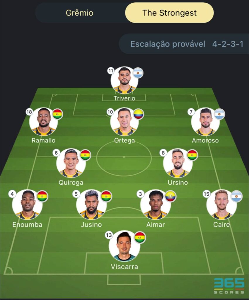 Provável escalação do The Strongest: Guillermo Viscarra; Maximiliano Caire (Torrelio), Darío Aimar, Adrián Jusino e Quaglio; Diego Wayar, Luciano Ursino, Joel Amoroso, Michael Ortega e Rodrigo Ramallo; Enrique Triverio.