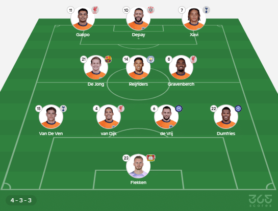 Provável escalação da Holanda: Flekken, Dumfries, De Vrij, Van Dijk, Van de Ven; Reijnders, Gravenberch, De Jong; Simons, Gakpo, Depay. Técnico: Ronald Koeman