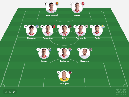 Provável escalação da Polônia: Skorupski, Kedziora, Bednarek, Kiwior; Cash, Piotrowski, Slisz, Frankowski, Zalewski; Piatek, Lewandowski. Técnico: Jan Urban