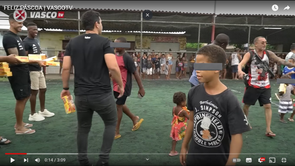 Durante a entrega de chocolate às crianças da comunidade, um homem armado e vestido com uma camisa de uma organizada do Flamengo foi flagrado. O vídeo foi divulgado pela Vasco TV.