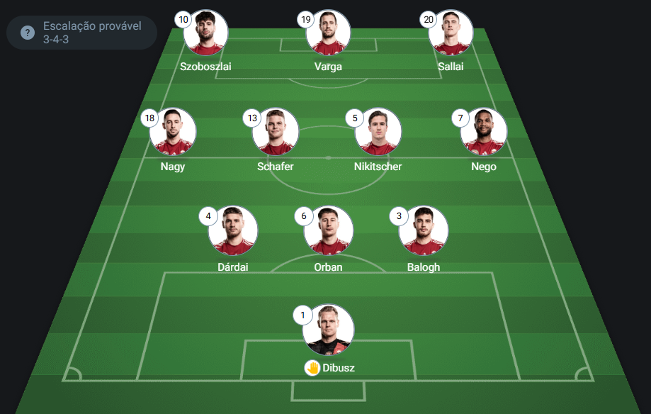 Provável escalação da Hungria: Dibusz, Dárdai, Orban e Balogh; Nagu, Schafer, Nikitscher e Nego; Szoboszlai, Varga e Sallai. Técnico: Marco Rossi.